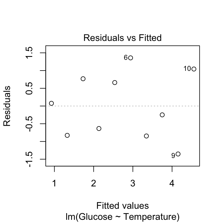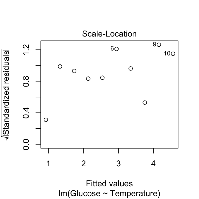 Finally, we can produce a scale-location diagnostic plot using the plot function to assess the constant variance assumption. Here we use which = 3 and again we suppress the line (using add.smooth = FALSE) to avoid finding spurious patterns:
