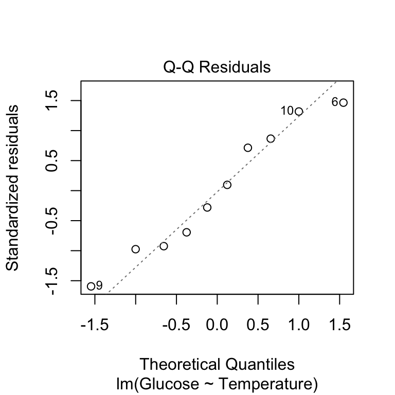 This looks very good. The points don’t deviate from the line systematically, except for a couple at the lower end (that’s not unusual), so it looks like the normality assumption is satisfied.